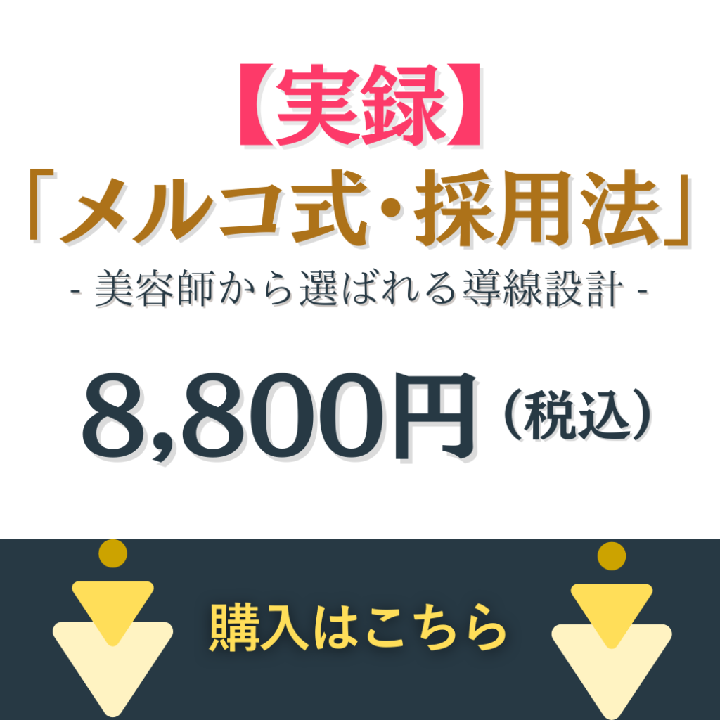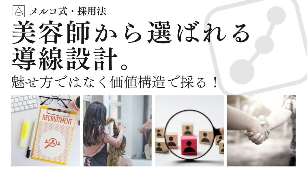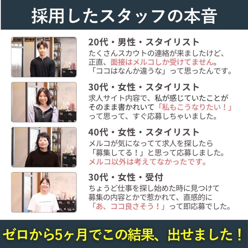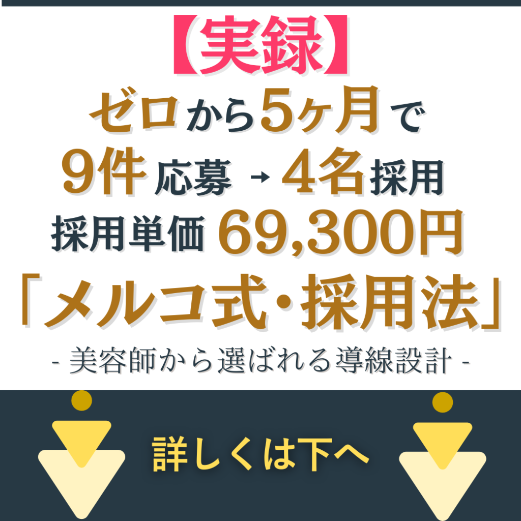 美容師の採用がここまで難しくなった時代に、ゼロから5ヶ月で「9件応募→4名採用」を実現したメルコの実録ノウハウを、包み隠さず公開します。